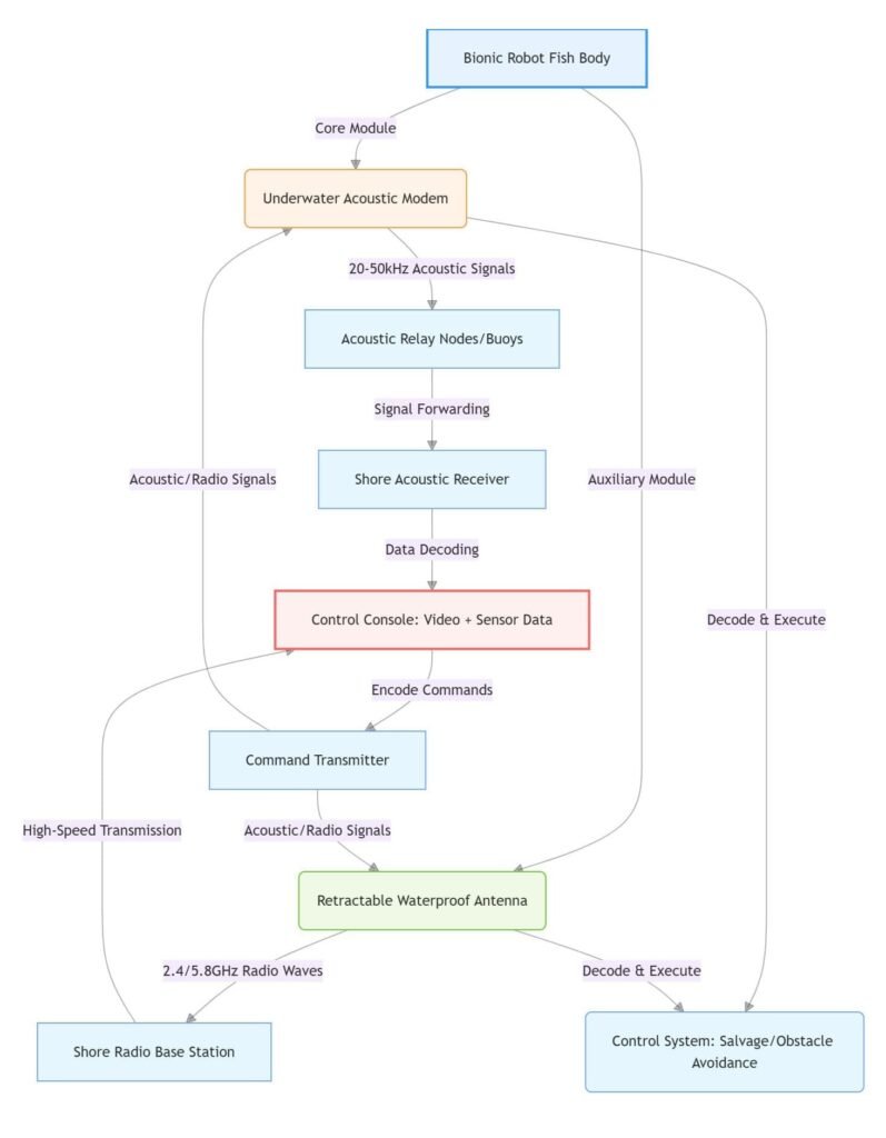 Electromagnetic waves attenuate rapidly underwater, so sound waves are mainly used for signal transmission. The robot fish is equipped with an underwater acoustic modem, which transmits video, sensor data, and position information to buoys or shore-based base stations via sound waves of specific frequencies (usually 20–50 kHz). The delay generally ranges from hundreds of milliseconds to several seconds, which is greatly affected by water quality and distance.